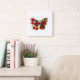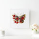 Red peacock eyed flower butterfly with red textured wing, decorated with composition of red, artistically painted roses with golden stems and leaves on white background.