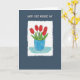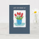 This greeting card features a simple drawing framed by a softly textured white border on a deep, calm blue background. In the center, five red flowers bloom with slightly uneven, hand-drawn lines, giving them a sweet, friendly feel ❤️. Slender green stems rise from a sturdy blue pot, as if the flowers are leaning toward each other in a gentle, affectionate cluster. Beneath the pot, a lighter aqua area suggests a tabletop or reflective surface, adding a quiet sense of closeness to the scene. Above the framed illustration, a short congratulatory message appears in white lettering, standing out clearly against the dark blue. The mix of red petals, green stems, and layered blues creates a bright, cheerful balance that feels like a small celebration 🌼. The flower pot is shaded in azure tones, and the aqua plane sits just below it with soft edges.