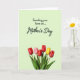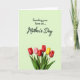 This card features a light green background that sets a calm, fresh scene for a Mother’s Day message, with a gentle, affectionate mood in the overall layout ❤️. The main text sits centered in the upper half, spaced with plenty of room around it so it feels easy to read and thoughtfully placed. The lettering is dark and flowing, standing out clearly against the pale green, like a quiet note written with care. Below the words, a small garden-like cluster of five tulip-shaped blooms gathers close together, as if leaning in like friends sharing a tender moment. Most of the flowers are deep red, joined by one soft pink bloom that adds a sweet, caring contrast, plus one bright yellow flower that brings a sunny lift 🌼. Slender green stems rise from broad green leaves, grounding the bouquet and giving it a fresh, springtime feel. The lower portion is anchored by the blossoms, with the red, pink, and yellow petals forming a neat row above the leafy base. The cup-shaped petals look gently closed, with smooth edges and rich color against the pale green backdrop.