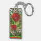 A sophisticated stained glass artwork featuring a vibrant red flower with green leaves over a bright blue background, adorned with intricate floral elements and elegant details that exude artistry and elegance.
