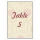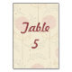 A beautifully designed table card, both sides has a red flower wedding flower blossoms incorporated into the design. . The table number is written using bold burgundy ink.