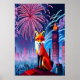 A red fox sitting on the roof in the bug city with firework over the city at New Year's Day in the background. This is a AI generated art.