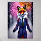 A Red fox in a uniform standing i the dark with firework in the background on New Year's Day. This is a AI generated art.