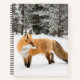 Red fox with bushy tail in cold white snow. Tall green pine tree forest in the background. Beautiful nature.