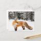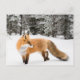 Red fox with bushy tail in cold white snow. Tall green pine tree forest in the background. Beautiful nature.