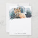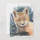 An elegant animal themed notecard featuring a watercolor painted baby red fox with fixated eyes against a teal blue watercolor wash background. The back of the card features a large-sized image of the fox.