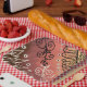 A cute, funny hand-drawn art pattern on a red background.