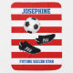 This baby blanket has a design featuring a pair of soccer shoes and a soccer ball and is ready for you to personalize with your baby's name. The accompanying caption is simply "FUTURE SOCCER STAR" or you can customize this too. The background has broad stripes in colors of deep red and white. On the back is a repeating geometric pattern of soccer balls on a deep red background.