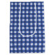 Red gift tag with pine berry and striped string bow on blue and white gingham pattern,