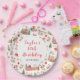 This elegant and festive plate features a watercolor gingerbread house, gingerbread train, cake stand, cookie jar, hot cocoa, red poinsettia flowers and Christmas trees. The text combines handwritten script and sans serif fonts for a stylish and modern look. This is perfect for Christmas birthday parties.