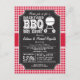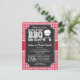 Chalkboard look Neutral couples bbq baby shower invitation on red gingham pattern. Vintage feel chalk fonts on cool blackboard background with cute, bbq grill clip art.