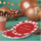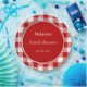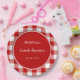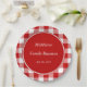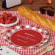 Large red circle in the center of the plate over a red and white gingham pattern. Customize the text in the center of the plate for your own event or remove the text for a classic look.