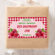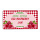 Red Gingham background with a lower right and left corner elements of a group of 3 red raspberries. Four groups of customizable text in coordinating colors of red and fresh green.