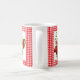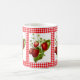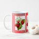 Decorate your kitchen for the summer season with this darling gingham pattern coffee mug/ This mug features a red and white gingham pattern with tree strawberry plant overlay. The strawberry plant has red plump berries, green leaves, and white flowers. This mug will compliment a classic white kitchen that features country-style decor.