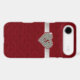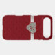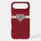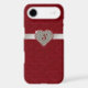 Chic iPhone 6 Plus case, done in graphics of a red tufted velvet look, with a ruby outlined diamond heart, on a silver glittery looking ribbon. Personalize the red one letter monogram. Glamorous way to protect your iPhone 6 and look stylish too, and makes a great gift idea.
