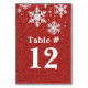 Festive holiday party table number card done in a red glitter looking background, with white snowflakes hanging down from the top of the card. Text in white is ready to personalize for your party.