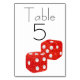 This glamorous custom table number card features a red and white casino design. An image of large, red glitter dice is printed across the center over a white background. You can personalize the table card to include your own custom name or text.