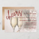 Champagne glasses, a clock about to strike midnight with gold sparkles, and the word cheers in red glitter script make the perfect backdrop for this festive New Year's Eve party invitation. Invite your friends to ring in the new year with you and celebrate in style.