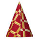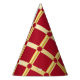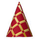 Elegant red and golden paper party hat. Ideal for festive special occasions. Red background with golden Arabic-inspired pattern in modern style. Abstract, illustration, elegant, geometric, modern, ethnic, baroque, luxury, Arabic, Moorish, motif.