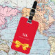A red background. Decorated with a faux gold looking bow. Personalize and add your monogram letters and full name on the front. Your contact information on the back.