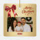 A faux gold looking background, red text and a red bow. Text and photo. Merry Christmas is written with a elegant hand-lettered style font.