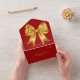 A red background, decorated with a large golden bow. Personalize and add names, party details, RSVP date, return address and name.