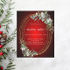 A red gradient background. An oval faux gold frame decorated with cones, white berres and pine greenery. Personalize and add the details. White text.