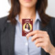 Red Gold Leaf Plastic Badge - Vertical to identify all the members of your production team. You can personalize it with a photo, a logo, and text. The badge measures 2.13 inches x 3.38 inches and is made of PVC Plastic which makes this ID Badge durable, and it won't fade or tear.