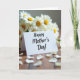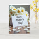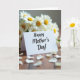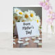 This greeting card stands upright on a richly textured wooden surface, drawing your eye with its crisp white face and quiet, affectionate mood ❤️. The message “Happy Mother’s Day!” sits centered on the front in a flowing dark ink style, with generous spacing around it that makes the words feel calm and cared for. Behind the card, white-petaled flowers with golden centers gather in a soft blur, like a gentle bouquet leaning in close as if sharing a tender moment. The warm brown wood beneath adds a cozy, homey setting, and the grain lines run naturally under the card like a steady foundation. A few loose white petals rest in the foreground, some sharp and some softly out of focus, suggesting a recent loving gesture and a touch of closeness 🌼. The lighting is soft and warm, creating smooth highlights along the card’s edges and a mellow glow across the tabletop. The background flowers form a pale halo, keeping attention on the centered greeting while adding depth. Several scattered petals lie across the lower front area of the wooden surface, with one petal tilted slightly toward the card’s base.
