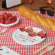 Red and Gold Ornament Christmas Holiday Party Paper Plates for a family or corporate Christmas Party.