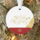 Celebrate the season with this stylish Christmas photo ornament. This design features modern gold lettering "My First Christmas" with geometric color blocks (Red & White). You can add your photo and personalize the text. More holiday gifts and cards are available at my shop BaraBomDesign.