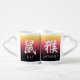 Celebrate romantic compatibility with these simple but striking lovers' mugs, which feature the Chinese letterforms for the Rat and the Monkey, the first and ninth signs/animals respectively in the Eastern zodiac, and the characters for yin and yang repeating on a gold-to-red gradient background. Personalize with a name or initials!