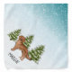 Destei's original cartoon illustration of a cute mahogany red or reddish brown Golden Retriever breed dog. The dog is placed in a winter scene with three green fir trees and falling snow. The background is a blue to white gradient giving the design that cold winter day look. There is also a personalizable text area for a name.
