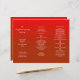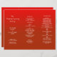 Tri-fold red wedding program to fold after purchase. White text is uppercase printing with script for the title. Red color on both sides of the paper is a light to dark red gradient. Use all capital letters to recreate this look. Customize three sections which will create an accordion style ceremony program. Lines on the back are provided to help fold evenly.