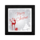 Giving a loved one some special jewelry this Christmas? Complete the package with this festive red, silver grey, and white "Merry Christmas" wood and ceramic tile topped jewelry gift box with a deer with antlers adorned with holly and berries, a red gift with ribbons, snowflakes, stars, and a variety of Christmas trees on a foggy grey background with a snowy border on it. She'll be able to keep it forever.