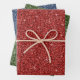 Set of three, one red, one green and one blue glitter wrapping paper sheets.