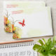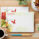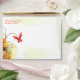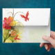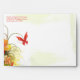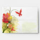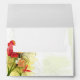This stylish chic wedding A7 card envelope has a red and green watercolor floral design with two butterflies flying at the bottom left. At the bottom, there is a soft grey silhouette of some water lily flowers. In the background, there is a soft green distressed look. On the front, you can easily personalize this with your name and address.