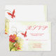 This stylish chic 3.5x5 Wedding RSVP reply flat card has a red and green watercolor floral design with two butterflies flying at the bottom left. At the bottom, there is a soft grey silhouette of some water lily flowers. In the background, there is a soft green distressed look. On the right, you can easily customize the wedding RSVP information. On the backside, there is a red butterfly flying on the left side.