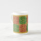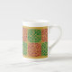 An elegant bone china mug with red and green Christmas art with a vintage fleur de lis pattern restored from antique tiles.