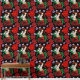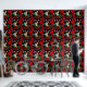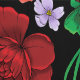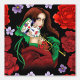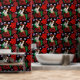 Auburn haired woman holding a Venetian masquerade mask wearing red and green in a backdrop of black