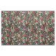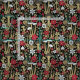 This fabric features red, green, and tan mushrooms and flowers on a black background.