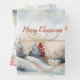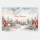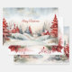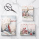 This set of three gift wrapping paper sheets has similar, but not identical, watercolor vintage Christmas scenes of rustic country houses, red and green pine trees and whimsical adornments in a woodlands landscape.