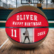 Custom Red Happy Birthday Photo Basketball. Birthday design with Happy birthday text, custom name, age, year and photo. Customize the age, name and add your photo. You can customize or erase any text on the basketball. Great birthday present for a basketball player or a fan.