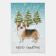 Destei's original cartoon illustration of a red headed tricolor coat color Pembroke Welsh Corgi breed dog. The dog is placed in a winter scene with three green fir trees and falling snow. The background is a blue to white gradient giving the design that cold winter day look. There is also a personalizable text area that now reads: "Merry Christmas!".