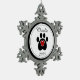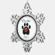 Personalize this keepsake ornament with the name of your fur baby. A black paw print and a red heart is featured in the center of a black and white circular background.