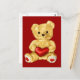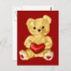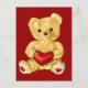 Cute postcard with an illustration of a fluffy teddy bear holding a red heart over a red background.