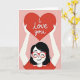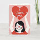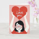 This card shows a young woman with sleek dark hair and red-framed glasses smiling with her eyes closed, her cheeks tinted a soft pink that echoes the pale pink background 🥰. She wears a deep red top, and her raised arms gently cradle a huge red heart that fills the upper part of the scene ❤️. The pose feels like a close, affectionate hug, as if she’s holding her feelings up for someone special to see. Across the heart, the words “i love you” sit centered in flowing white lettering that stands out sharply against the red. The figure is placed in the lower half of the card, while the heart dominates above, keeping your attention moving upward to the message. With only a few strong colors—red, pale pink, and white—the illustration stays simple and focused on her warm expression. The heart’s rounded edges and the soft blush on her cheeks are the clearest details against the smooth, uncluttered background.
