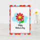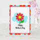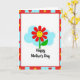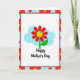 This card shows a smiling, cartoon-style flower centered on a white background, with red petals circling a sunny yellow face that has simple eyes and a friendly grin. A green stem and one curved leaf hold it upright, like it’s leaning in for a sweet hello ❤️. Behind the flower, a soft light-blue cloud shape floats like a gentle patch of sky, adding a calm, friendly setting. Beneath the flower, a short Mother’s Day message sits in dark lettering, centered and easy to spot against the white space. The flower’s cheerful expression and warm colors give the scene a cozy, affectionate feel, like a small gesture shared between close friends or family 🌼. Around the edges, a geometric frame alternates red sections with light-blue squares to create a lively border. Tiny yellow burst shapes decorate the red sections, while small red hearts sit inside the light-blue squares along the frame.