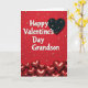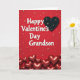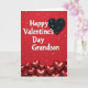 This Valentine's Day card has a deep red background sprinkled with tiny gold stars and small bead-like dots that look like little sparkles. The message “Happy Valentine’s Day Grandson” sits across the upper part of the card in thick white letters that stand out clearly. In the word “Valentine’s,” the apostrophe is replaced by a large black heart filled with gold dots and a few larger gold accents. Along the bottom, a group of shiny red hearts in different sizes is gathered together, catching the light like glitter. The mix of the dark heart, bright white lettering, and glowing red hearts makes the design feel loving and special. It’s a meaningful card to give because it feels like a warm hug and a clear reminder that your grandson is cared for ❤️. The stars and hearts add a celebratory touch without taking attention away from the message 🥰.