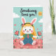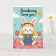Designed with a sweet spring scene, this card features an upright bunny-like character with soft white fur, long ears, and a tousled golden-orange tuft of hair topped with tiny pink blossoms 🐰🌷. The character sits in a flower-filled meadow, holding two small red bouquets close as if saving them for someone special, with a few floating red hearts nearby that hint at close friendship or romance. It wears blue overall-style clothing over an emerald green collared shirt, finished with a neat red tie that adds a charming, slightly formal touch. Across the top, the message “Somebunny loves you!” curves in a flowing cursive style, set in dark lettering that stands out clearly against the pale sky. Behind the figure, a light blue sky stretches upward with soft white clouds and a smiling sun that gives the scene a gentle, affectionate warmth 🐇. The foreground is filled with stylized pink and red blossoms layered over a warm earthy ground, creating a cozy garden setting. A small detail shows pink paw pads peeking out at the bottom as the character rests among the flowers.